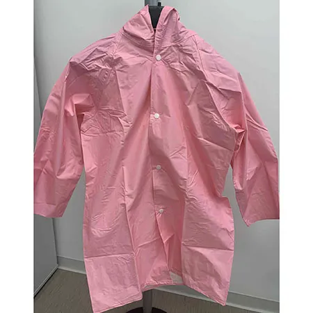 Manteau de pluie en matériau imperméable synthétique rose, conçu pour être porté par temps de pluie, avec une capuche et des attaches avec des boutons-pression à l’avant. Les informations indiquées sur l’étiquette d’étiquetage cousue dans la couture latérale: “SLR”, “50% polyester, 50% PVC”.