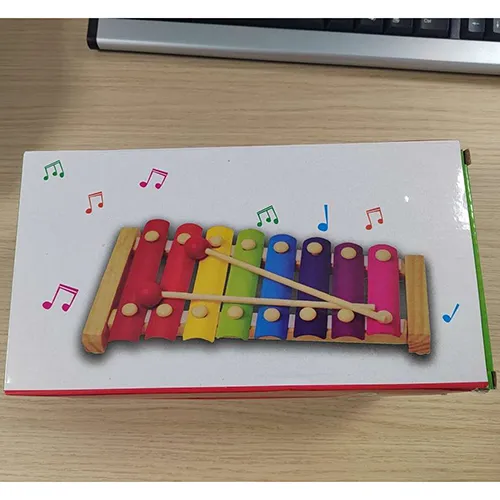 Xylophone en bois et métal multicolore, avec 2 maillets. Produit vendu en ligne, notamment via royaumemontessori.fr.