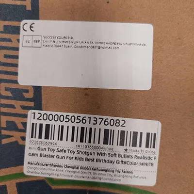 Pistolet à air comprimé en plastique blanc, bleu et noir, avec une paire de lunettes, une cible en carton, quatre obus et dix balles en mousse grise avec ventouses bleues. Produit vendu en ligne, notamment via AliExpress (identifiant unique du produit: 1005009914110938).