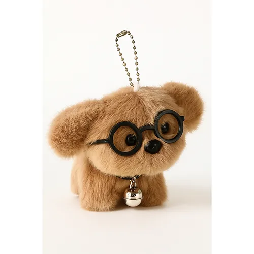 Jouet en peluche, en forme de chiot brun avec des lunettes noires et un collier avec une cloche. Produit vendu en ligne, notamment via Shein.