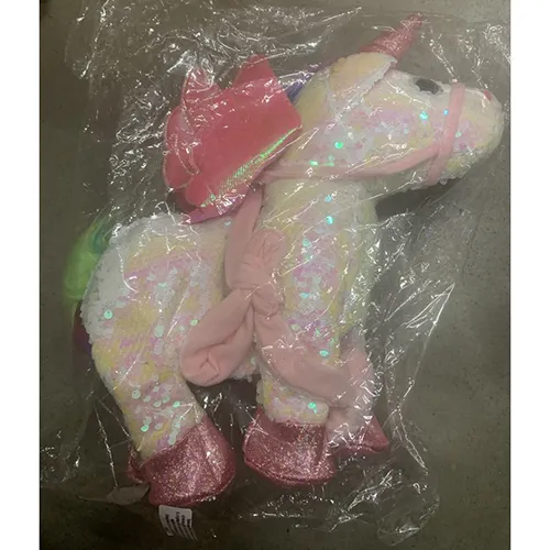 Licorne jouet alimentée par batterie avec une surface textile avec des écailles réversibles blanches / roses, La couleur des écailles change avec le toucher.La corne de la licorne est rose, brillante et elle a une sangle rose sur le museau, une crinière et une queue de couleur arc-en-ciel, des ailes roses attachées au dos et des chaussures roses sur le bas des jambes. Il dispose également d’un élément décoratif avec une forme de coeur h