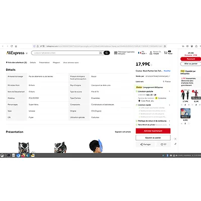 Costume de fantaisie représentant Wolverine, composé d’un body rembourré noir, d’un masque et de griffes pour les mains. Produit vendu en ligne, notamment via AliExpress (identifiant unique du produit: 1005008770457726).