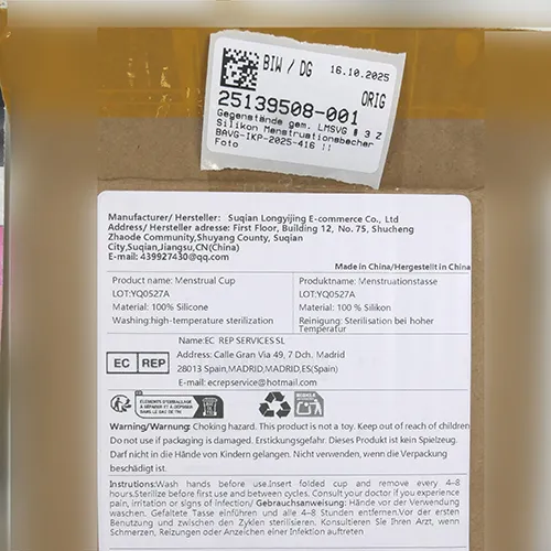 Coupe menstruelle en silicone blanc translucide. Produit vendu en ligne, notamment via Temu (identifiant unique du produit: 601100165351839).