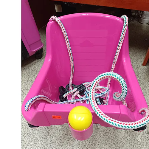 Pendaison de balançoire de jouet en plastique. Le système de suspension se compose d’une corde ancrée dans chaque coin de la balançoire et se termine par deux connecteurs avec des extrémités en plastique. Une corne en plastique est située dans la partie centrale avant.