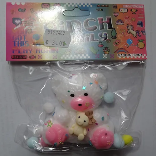Jouet anti-stress en plastique doux blanc de 7 cm avec pattes et nez de couleur rose. Dans le même emballage, il y a un ours de couleur brune en plastique avec un ruban dans une oreille, un petit ours (3 cm) et des boules multicolores en plastique. Huit pièces.