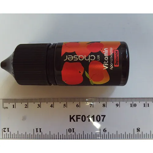 Cartouche de couleur foncée avec liquide contenant de la nicotine pour e-cigarettes.