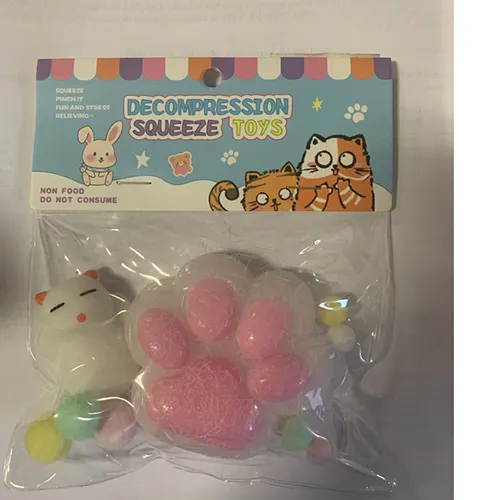 Ensemble de soulagement des contraintes compressibles, composé de: jouets en forme de chat et de patte, en matériau élastique et doux pour le pétrissage dans les mains, qui revient à sa forme originale lorsqu’il est pressé, et boules de différentes couleurs.