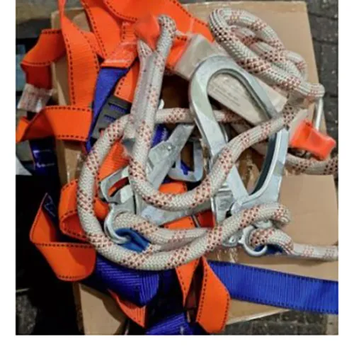 Équipement d’escalade avec deux mousquetons reliés par une attache (ceinture) et un harnais.