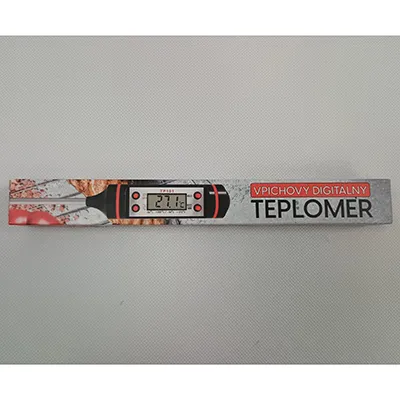 Thermomètre numérique avec écran LCD et quatre boutons rouges. Produit vendu en ligne, notamment via www.nay.sk.