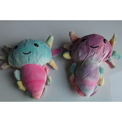 Jouet doux sous la forme d’un axolotl, avec des yeux en plastique noir. Produit vendu en ligne, notamment via TikTok.