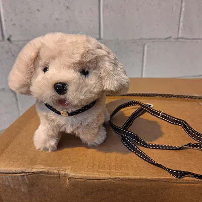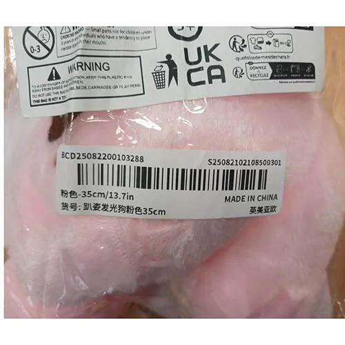Jouet doux lumineux à piles en forme de chien rose. Produit vendu en ligne, notamment via https://vm.tiktok.com.