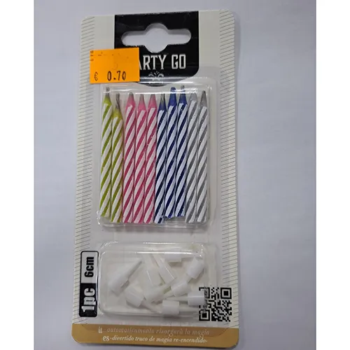 Bougie sertie en quatre couleurs différentes. Les bougies sont emballées dans un sac en plastique de 10 pièces, chacune avec un bougeoir en plastique.