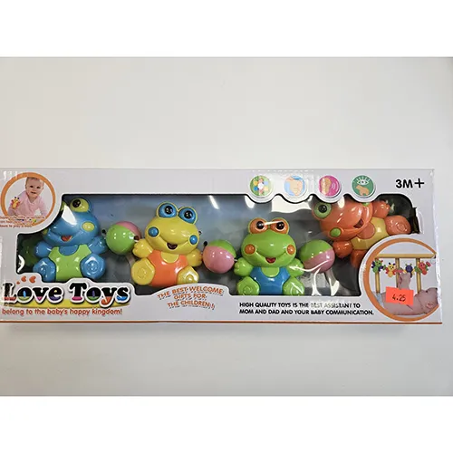 Jouet hochet fait de figures colorées en forme de grenouille enfilées sur une ficelle, avec des boules rondes entre les deux.