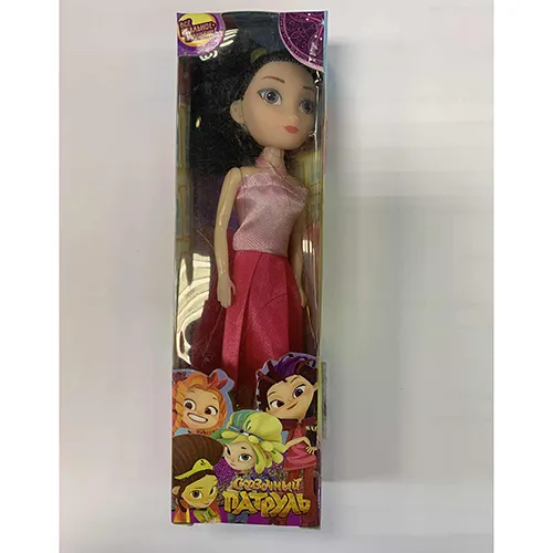 Poupée en plastique inspirée de la série animée Fairytale Patrol. La poupée est vêtue d’une robe rose et framboise et a de longs cheveux foncés.